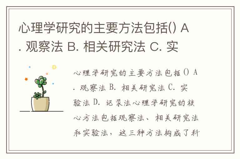 心理学研究的主要方法包括() A. 观察法 B. 相关研究法 C. 实验法 D. 记录法