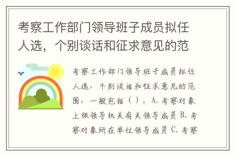 考察工作部门领导班子成员拟任人选,个别谈话和征求意见的范围,一般包括()。A.考察对象上级领导机关有关领导成员 B.考察对象所在单位领导成员 C.考察对象所在单位内设机构担任主要领导职务的人员和直属单位主要领导成员 D.其他有关人员