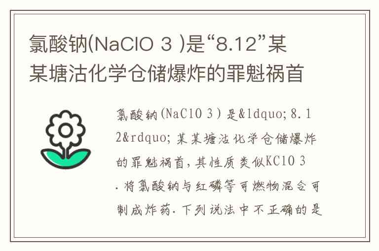 氯酸钠(NaClO 3 )是“8.12”某某塘沽化学仓储爆炸的罪魁祸首,其性质类似KClO 3 .将氯酸钠与红磷等可燃物混合可制成炸药.下列说法中不正确的是( ) A. NaClO3在爆炸中提供氧,具有氧化性 B. 可用NaClO3作原料制取氧气 C. 红磷在反应中发生了氧化反应 D. NaClO3