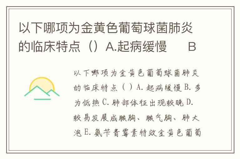 以下哪项为金黄色葡萄球菌肺炎的临床特点()A.起病缓慢 B.多为低热 C.肺部体征出现较晚 D.较易发展成脓胸、脓气胸、肺大泡 E.氨苄青霉素特效