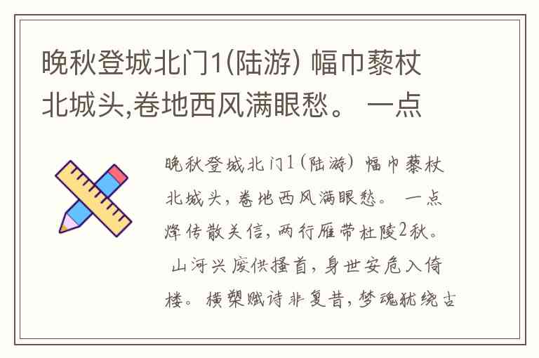 本诗以“愁”为线索贯穿全篇,主要通过记叙与抒情结合展开,而非“描写与议论相结合”。首联“幅巾藜杖北城头”以白描手法刻画诗人登楼形象,“卷地西风满眼愁”奠定悲秋基调;颔联“一点烽传散关信,两行雁带杜陵秋”借烽火、鸿雁传递对边境安危的忧虑和对故都汴京的怀念;颈联“山河兴废供搔首,身世安危入倚楼”通过“搔首”“倚楼”的动作细节,展现诗人对国家命运和个人境遇的双重忧思;尾联“横槊赋诗非复昔,梦魂犹绕古梁州”以今昔对比抒发壮志难酬的悲愤,“非复昔”的感慨与“犹绕”的执着形成强烈情感张力。全诗语言凝练,情感层层递进,将个人遭际与家国命运紧密交织,爱国情怀深沉动人。