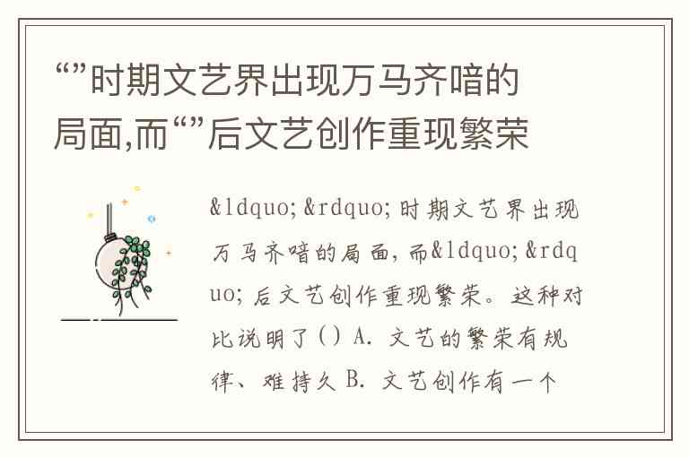 “”时期文艺界出现万马齐喑的局面,而“”后文艺创作重现繁荣。这种对比说明了( ) A. 文艺的繁荣有规律、难持久 B. 文艺创作有一个兴衰交替的反复周期 C. 文艺的兴衰受制于一定时期的政治环境 D. “”对文艺有重大影响