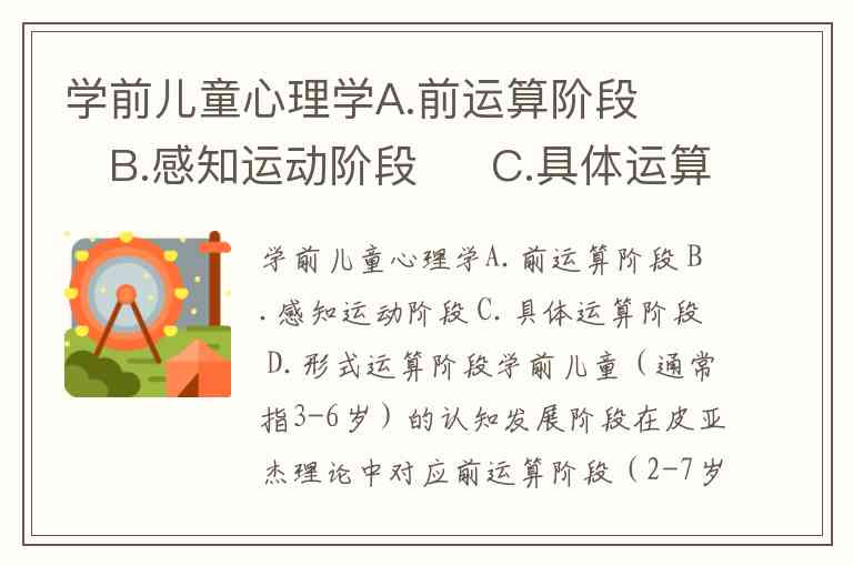 学前儿童心理学A.前运算阶段 B.感知运动阶段 C.具体运算阶段 D.形式运算阶段