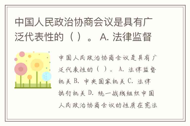 中国人民政治协商会议是具有广泛代表性的( )。 A. 法律监督机关 B. 中央国家机关 C. 法律执行机关 D. 统一战线组织