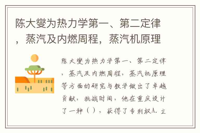 陈大燮为热力学第一、第二定律,蒸汽及内燃周程,蒸汽机原理等方面的研究与教学做出了卓越贡献,抗战时间,他在重庆设计了一种(),获得了专利权A.立式管锅炉 B.热式管锅炉 C.管锅炉 D.热力管锅炉