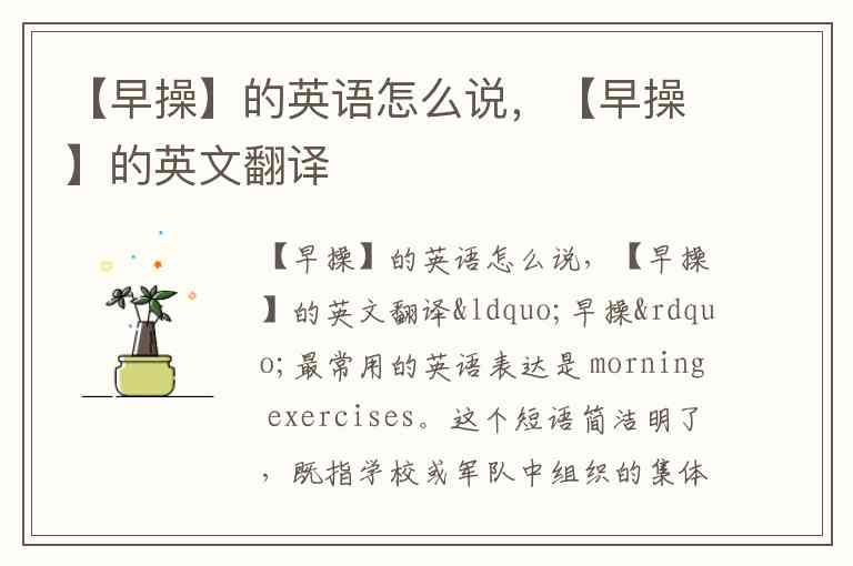 “早操”最常用的英语表达是 morning exercises。这个短语简洁明了,既指学校或军队中组织的集体晨练活动,也可泛指早晨进行的健身运动。