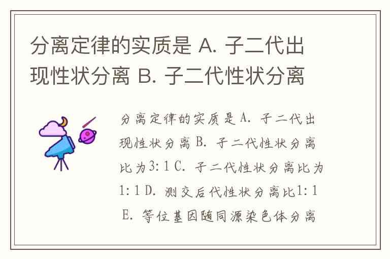 分离定律的实质是 A. 子二代出现性状分离 B. 子二代性状分离比为3:1 C. 子二代性状分离比为1:1 D. 测交后代性状分离比1:1 E. 等位基因随同源染色体分离而分开