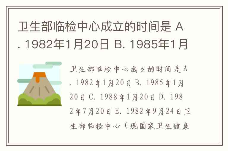 卫生部临检中心成立的时间是 A. 1982年1月20日 B. 1985年1月20日 C. 1988年1月20日 D. 1982年7月20日 E. 1982年9月24日
