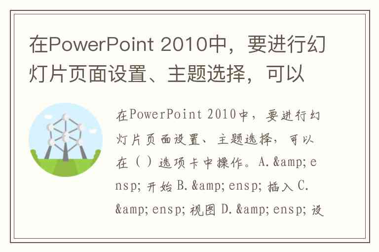 在PowerPoint 2010中,要进行幻灯片页面设置、主题选择,可以在()选项卡中操作。A. 开始 B. 插入 C. 视图 D. 设计