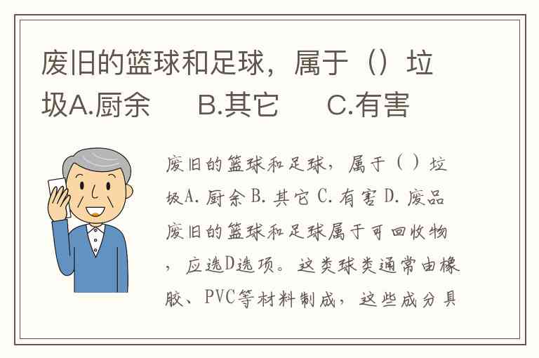 废旧的篮球和足球,属于()垃圾A.厨余 B.其它 C.有害 D.废品