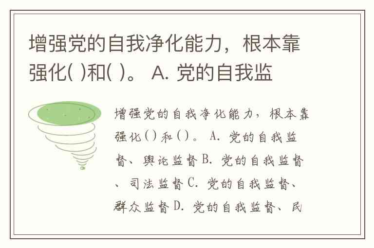 增强党的自我净化能力,根本靠强化( )和( )。 A. 党的自我监督、舆论监督 B. 党的自我监督、司法监督 C. 党的自我监督、群众监督 D. 党的自我监督、民主监督