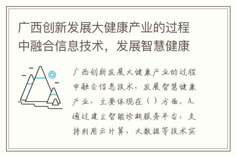 广西创新发展大健康产业的过程中融合信息技术,发展智慧健康产业,主要体现在()方面。A.通过建立智能诊断服务平台,支持利用云计算、大数据等技术实现个性化健康管理服务,构建以社区为基础的养老信息服务网络平台 B.积极打造构建集生产、存储、物流为一体的专业性医疗器械产业园区 C.加快广西国际壮医医院的升级改造工作 D.通过优化营商环境,促进对区外医药生产企业整体或部分迁入我.区和区内迁建,依法依规优先办理生产许可证和加快并联审批工作流程
