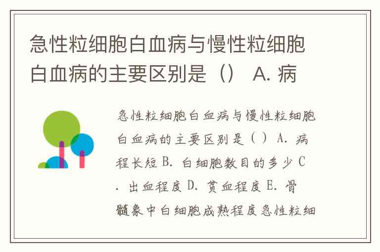 急性粒细胞白血病与慢性粒细胞白血病的主要区别是() A. 病程长短 B. 白细胞数目的多少 C. 出血程度 D. 贫血程度 E. 骨髓象中白细胞成熟程度