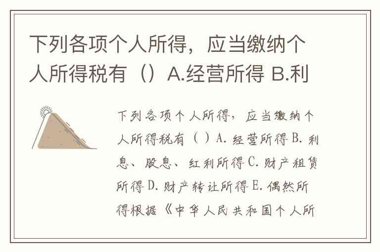 下列各项个人所得,应当缴纳个人所得税有()A.经营所得 B.利息、股息、红利所得 C.财产租赁所得 D.财产转让所得 E.偶然所得