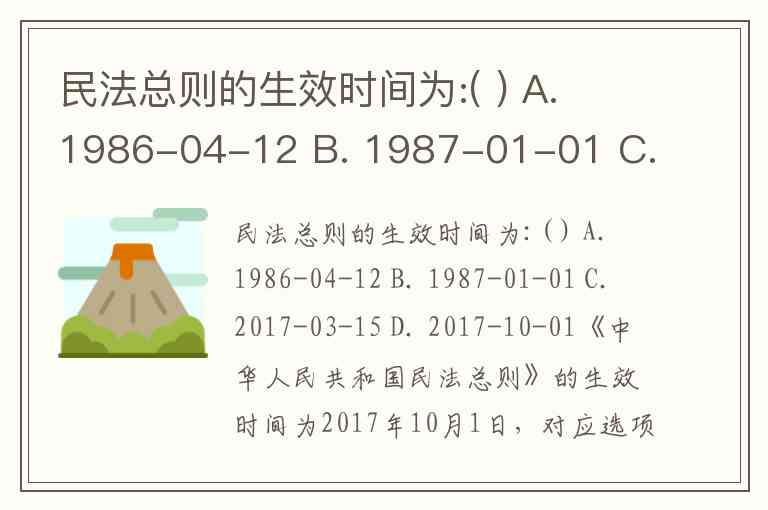 民法总则的生效时间为:( ) A. 1986-04-12 B. 1987-01-01 C. 2017-03-15 D. 2017-10-01