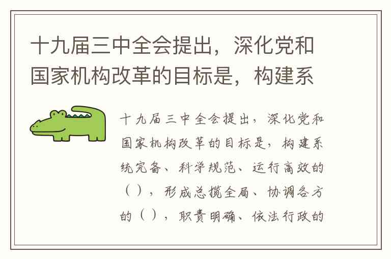 答案为 C。根据《中共中央关于深化党和国家机构改革的决定》,十九届三中全会明确深化党和国家机构改革的目标是“构建系统完备、科学规范、运行高效的党和国家机构职能体系,形成总揽全局、协调各方的党的领导体系……联系广泛、服务群众的群团工作体系”。这一目标构建了“职能体系—领导体系—群团体系”的逻辑链条,其中党和国家机构职能体系是基础框架,党的领导体系是核心保障,群团工作体系是联系群众的重要纽带。这一改革旨在推动各类治理主体在党的统一领导下形成合力,是推进国家治理体系和治理能力现代化的关键举措。
