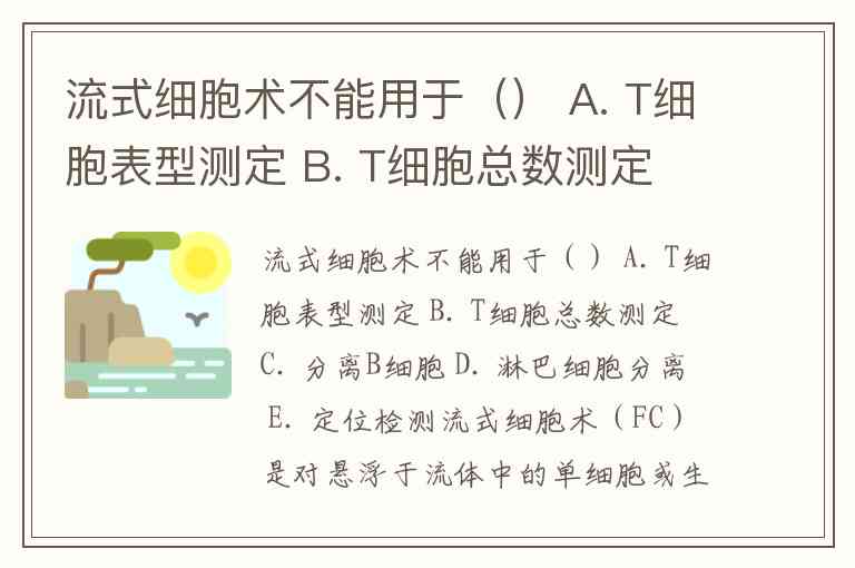 流式细胞术不能用于() A. T细胞表型测定 B. T细胞总数测定 C. 分离B细胞 D. 淋巴细胞分离 E. 定位检测