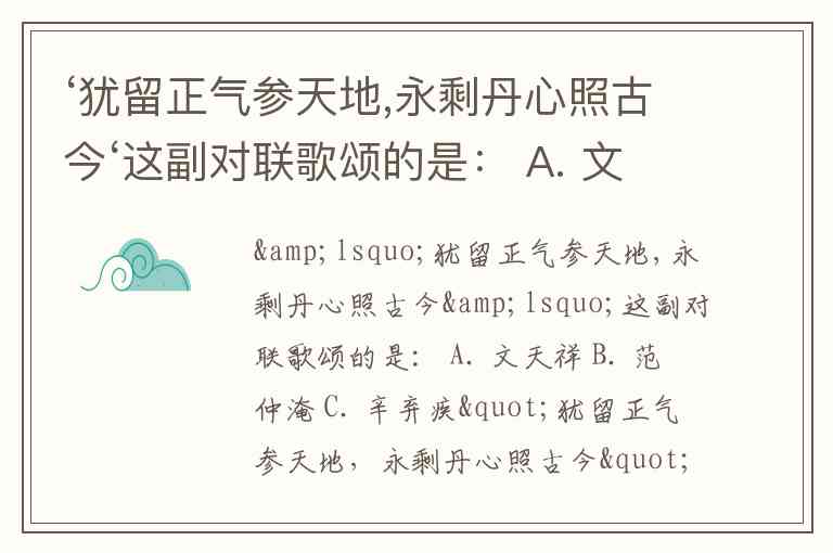 ‘犹留正气参天地,永剩丹心照古今‘这副对联歌颂的是: A. 文天祥 B. 范仲淹 C. 辛弃疾