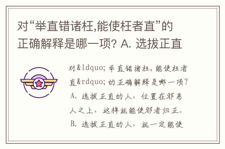 对“举直错诸枉,能使枉者直”的正确解释是哪一项? A. 选拔正直的人,位置在邪恶人之上,这样就能使邪者归正。 B. 选拔正直的人,就一定能使邪者归正吗? C. 推举正直的人,能使受到冤枉的人也变得正直。 D. 选拔正直坦率的人,位置在心理扭曲的人之上,这样就能使心理扭曲者归正。
