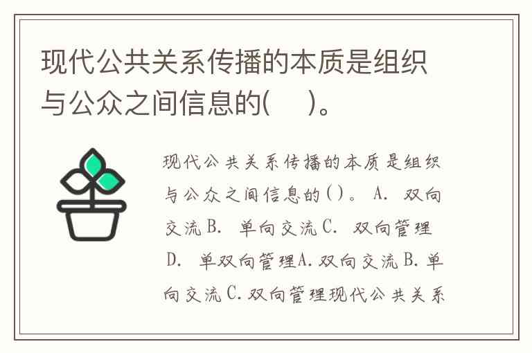 现代公共关系传播的本质是组织与公众之间信息的( )。 A.双向交流 B.单向交流 C.双向管理 D.单双向管理A.双向交流 B.单向交流 C.双向管理
