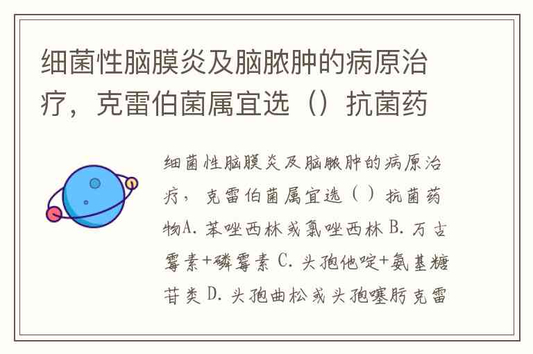 细菌性脑膜炎及脑脓肿的病原治疗,克雷伯菌属宜选()抗菌药物A.苯唑西林或氯唑西林 B.万古霉素+磷霉素 C.头孢他啶+氨基糖苷类 D.头孢曲松或头孢噻肟