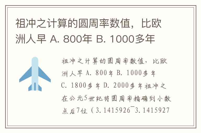 祖冲之计算的圆周率数值,比欧洲人早 A. 800年 B. 1000多年 C. 1800多年 D. 2000多年