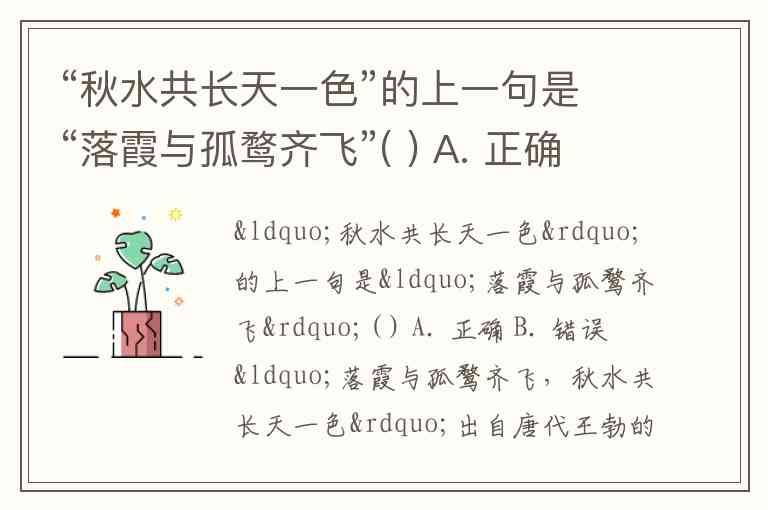 “秋水共长天一色”的上一句是“落霞与孤鹜齐飞”( ) A. 正确 B. 错误