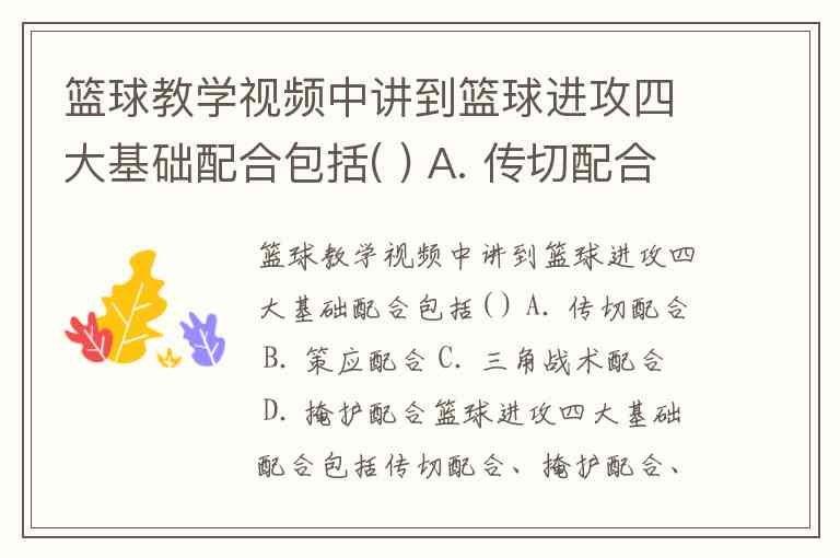 篮球教学视频中讲到篮球进攻四大基础配合包括( ) A. 传切配合 B. 策应配合 C. 三角战术配合 D. 掩护配合