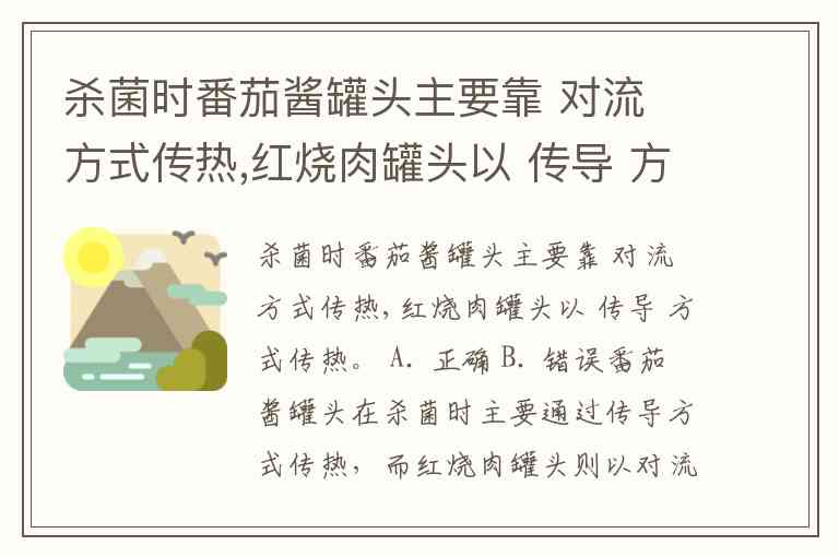 杀菌时番茄酱罐头主要靠 对流 方式传热,红烧肉罐头以 传导 方式传热。 A. 正确 B. 错误