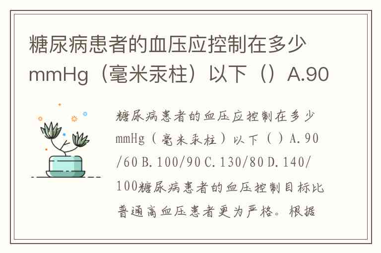 糖尿病患者的血压应控制在多少mmHg(毫米汞柱)以下()A.90/60 B.100/90 C.130/80 D.140/100