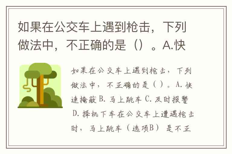 如果在公交车上遇到枪击,下列做法中,不正确的是()。A.快速掩蔽 B.马上跳车 C.及时报警 D.择机下车
