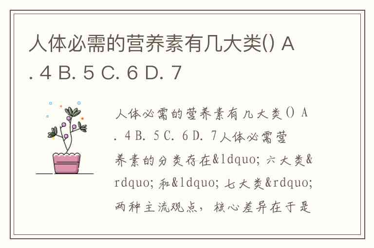 膳食纤维虽不能被人体消化吸收,但能促进肠道蠕动、调节代谢,对预防慢性病至关重要,因此被部分权威资料纳入必需营养素范畴。若题目选项中同时出现6和7,需结合具体教材或考试标准判断;根据本题提供的选项(A.4 B.5 C.6 D.7),C.6和D.7均有文献支持,但传统分类(六大类)在基础生物学教材中更为常见。