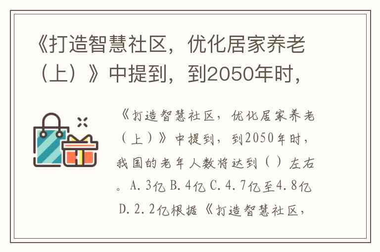 《打造智慧社区,优化居家养老(上)》中提到,到2050年时,我国的老年人数将达到()左右。A.3亿 B.4亿 C.4.7亿至4.8亿 D.2.2亿