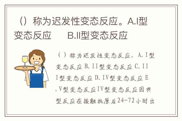()称为迟发性变态反应。A.I型变态反应 B.II型变态反应 C.III型变态反应 D.IV型变态反应 E.V型变态反应