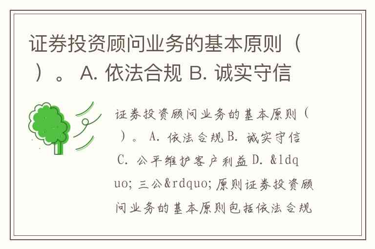 需要注意的是,选项D“三公”原则(公开、公平、公正)是证券市场的总体原则,并非证券投资顾问业务特有的基本原则。而部分文档提及的“廉洁从业”,目前并非《证券投资顾问业务暂行规定》中明确列举的核心原则。这些原则共同构建了保护投资者权益、规范行业行为的制度保障,投资者在接受服务时可据此监督机构行为。