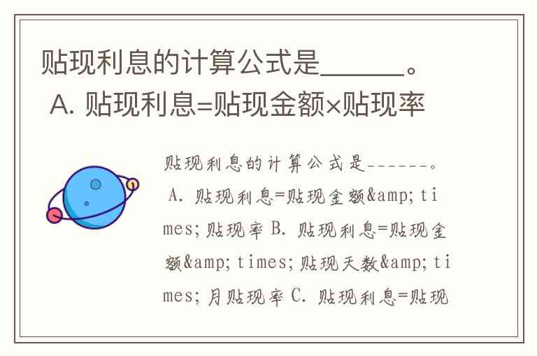 贴现利息的计算公式是 C. 贴现利息=贴现金额×贴现天数×(月贴现率÷30)。这一公式的核心逻辑是将月贴现率转换为日贴现率(即月贴现率÷30),再与贴现金额、贴现天数相乘得出利息,与多份权威资料的表述一致。