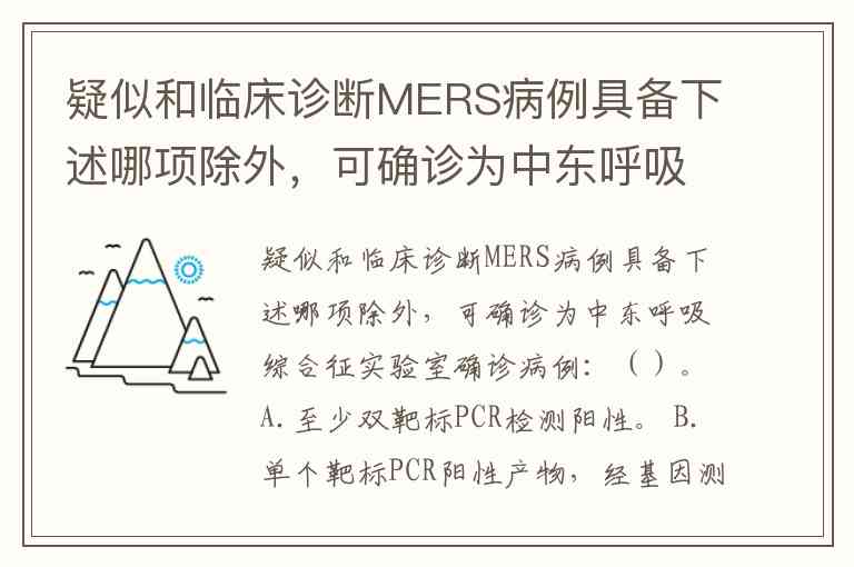 疑似和临床诊断MERS病例具备下述哪项除外,可确诊为中东呼吸综合征实验室确诊病例:()。A.至少双靶标PCR检测阳性。 B.单个靶标PCR阳性产物,经基因测序确认。 C.从呼吸道标本中分离出中东呼吸综合征冠状病毒。 D.恢复期血清中东呼吸综合征冠状病毒抗体较急性期血清抗体水平阳转或呈8倍以上升高。 E.医务人员应当根据导致感染的风险程度采取相应的防护措施。