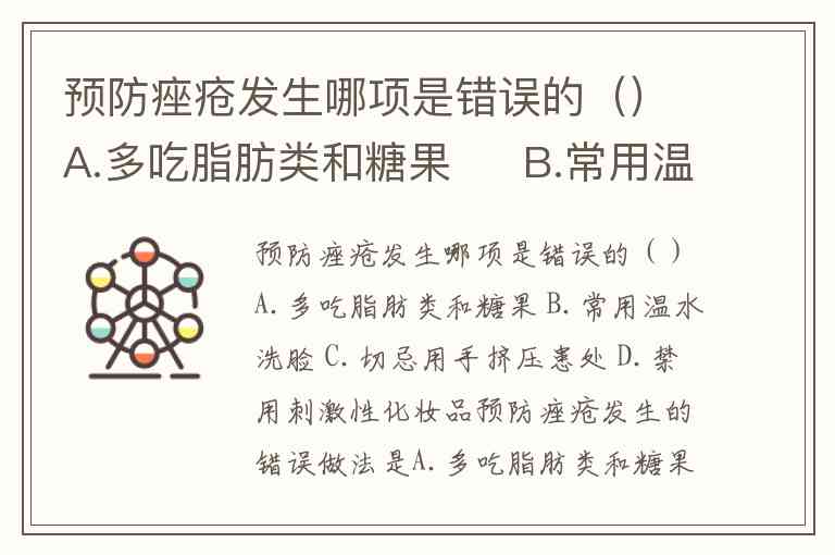 预防痤疮发生的错误做法是A.多吃脂肪类和糖果。这一结论基于多项研究证实的饮食与痤疮的密切关联:高糖和高脂食物会显著刺激皮脂腺分泌油脂,加剧毛囊堵塞和炎症反应。