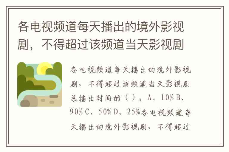各电视频道每天播出的境外影视剧,不得超过该频道当天影视剧总播出时间的()。A、10% B、90% C、50% D、25%