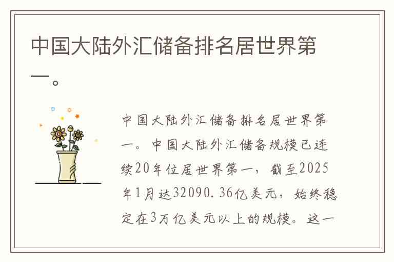 中国大陆外汇储备排名居世界第一。