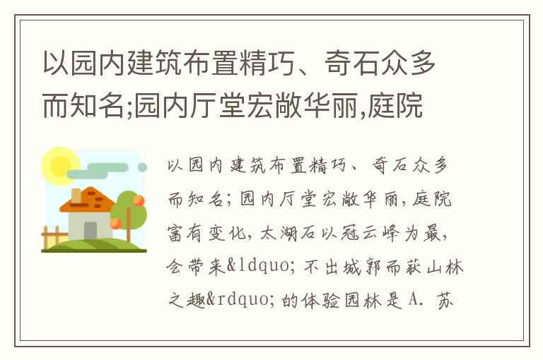 以园内建筑布置精巧、奇石众多而知名;园内厅堂宏敞华丽,庭院富有变化,太湖石以冠云峰为最,会带来“不出城郭而获山林之趣”的体验园林是 A. 苏州拙政园 B. 苏州留园 C. 苏州狮子林 D. 扬州个园