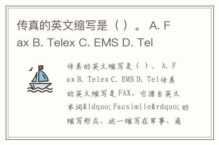 传真的英文缩写是( )。 A. Fax B. Telex C. EMS D. Tel