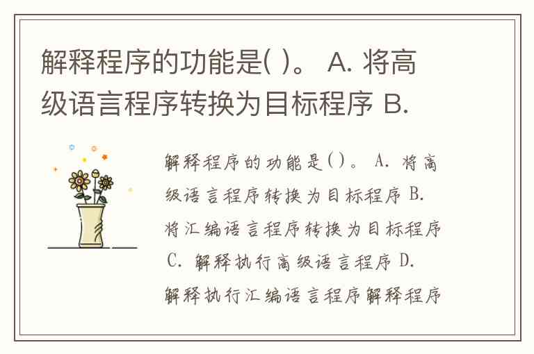解释程序的功能是( )。 A. 将高级语言程序转换为目标程序 B. 将汇编语言程序转换为目标程序 C. 解释执行高级语言程序 D. 解释执行汇编语言程序