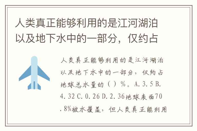 人类真正能够利用的是江河湖泊以及地下水中的一部分,仅约占地球总水量的()%。A.3.5 B.4.32 C.0.26 D.2.36