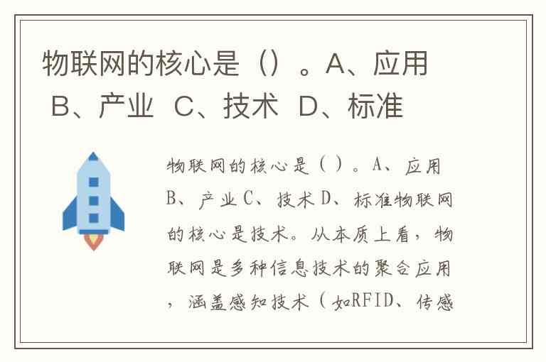 物联网的核心是()。A、应用 B、产业 C、技术 D、标准