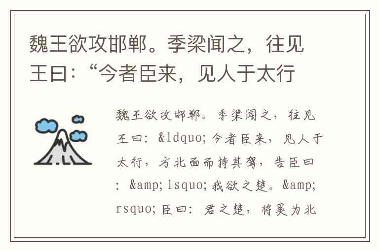 类比论证的核心在于同类事物的属性迁移。季梁并未直接批判魏王的决策,而是先构建一个易于理解的具象场景——方向与目标完全相反的北行楚客,其“马良、用多、御者善”的优势反而加剧了错误后果。随后将这一逻辑迁移至魏王攻赵的决策:“恃王国之大,兵之精锐”如同北行者的优越条件,“攻邯郸以广地尊名”则如同朝北行驶的错误方向,最终“王之动愈数,而离王愈远”的结论便不言自明。这种论证方式既避免了直接劝谏的对抗性,又通过形象的类比使抽象道理直观化,与《邹忌讽齐王纳谏》中“妻妾客之美我”的类比逻辑异曲同工。
