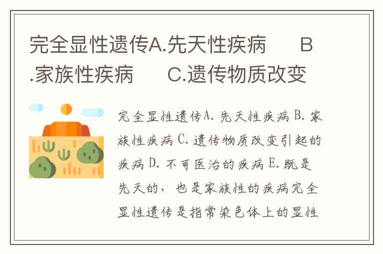 完全显性遗传A.先天性疾病 B.家族性疾病 C.遗传物质改变引起的疾病 D.不可医治的疾病 E.既是先天的,也是家族性的疾病