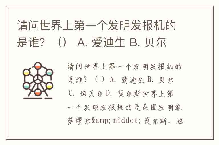 请问世界上第一个发明发报机的是谁?() A. 爱迪生 B. 贝尔 C. 诺贝尔 D. 莫尔斯