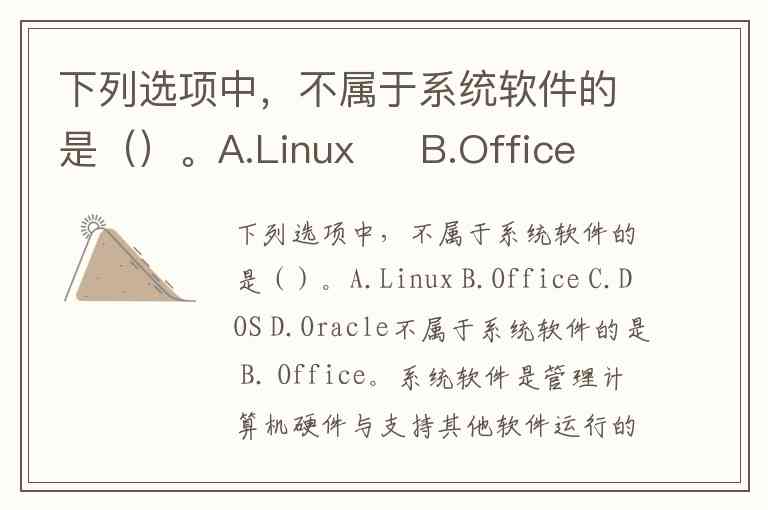 下列选项中,不属于系统软件的是()。A.Linux B.Office C.DOS D.Oracle