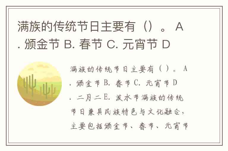 综上,满族的传统节日主要有颁金节、春节、元宵节、二月二,答案为A、B、C、D。这些节日不仅承载着满族的历史记忆和文化传承,也体现了中华民族多元文化的交流与融合。在今天,它们依然是满族同胞维系民族情感、增强文化自信的重要纽带。